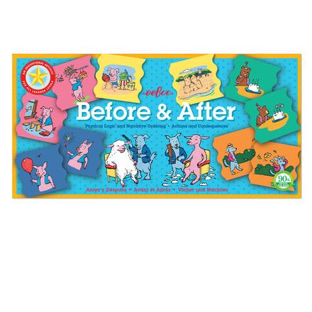 قبل وبعد هو نشاط تعليمي للأطفال للتعرف على العلاقة المنطقية بين السبب والنتيجة. يتضمن كل سيناريو مجموعتين من بلاطات تصور ما قبل وبعد. تحتوي المربعات على رسومات توضيحية مرحة تصور العديد من مواقف الحياة الواقعية لمنح الآباء فرصًا لمناقشة العالم من حولهم. 24 زوجًا من 2 بلاطات. يتضح من ساكستون فريمان