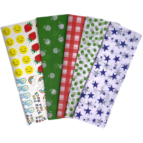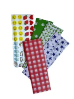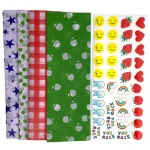 تتضمن التصاميم: 10 Blue Stars ، 10 Red Vichy ، 10 Green Polka Dots ، 10 Green Apple + 40 ملصقًا مع 8 تصميمات رائعة.