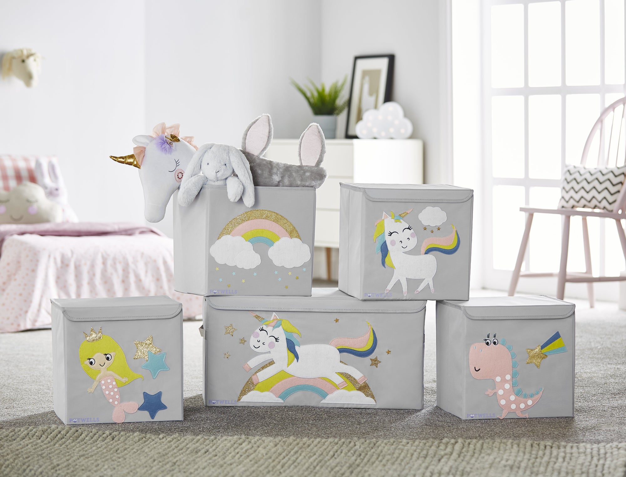 يمكن مسح هذه الصناديق الرمادية الناعمة ذات التصاميم المزخرفة نظيفة في حالة ظهور علامات على أيدي الأيدي الصغيرة.