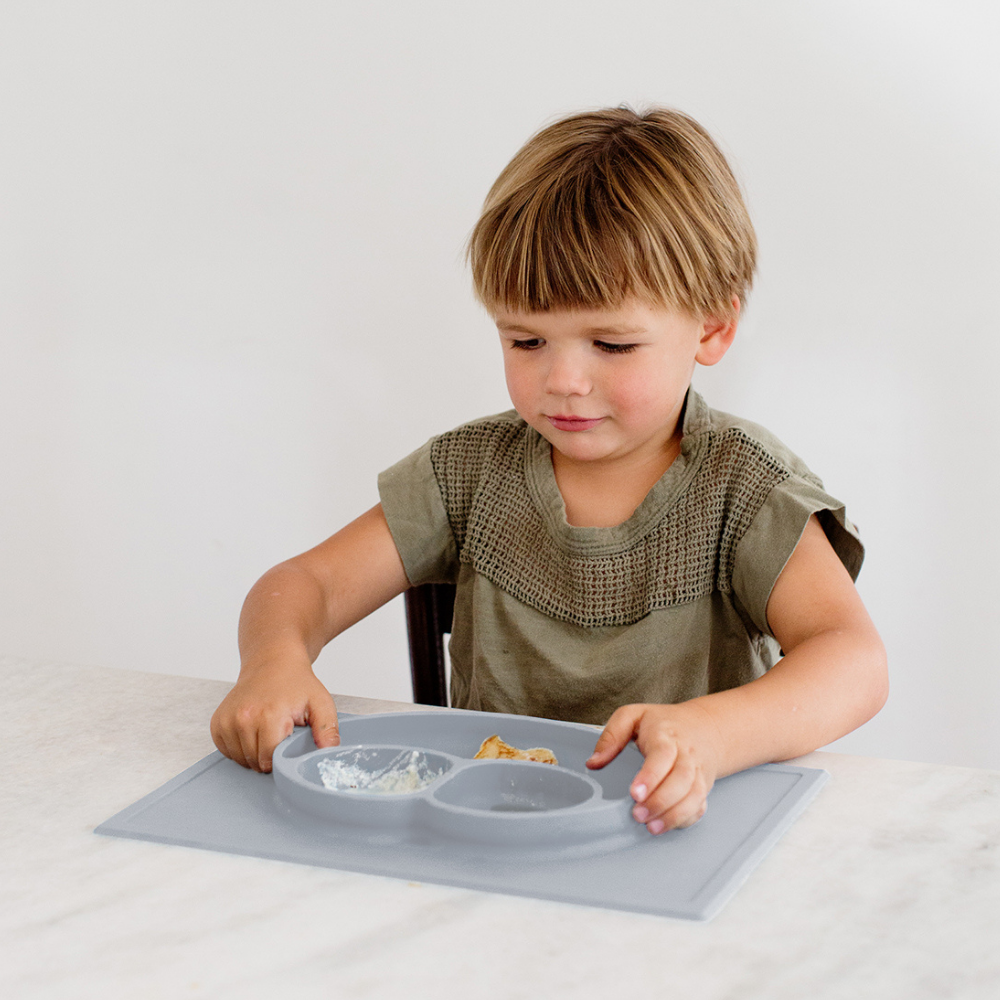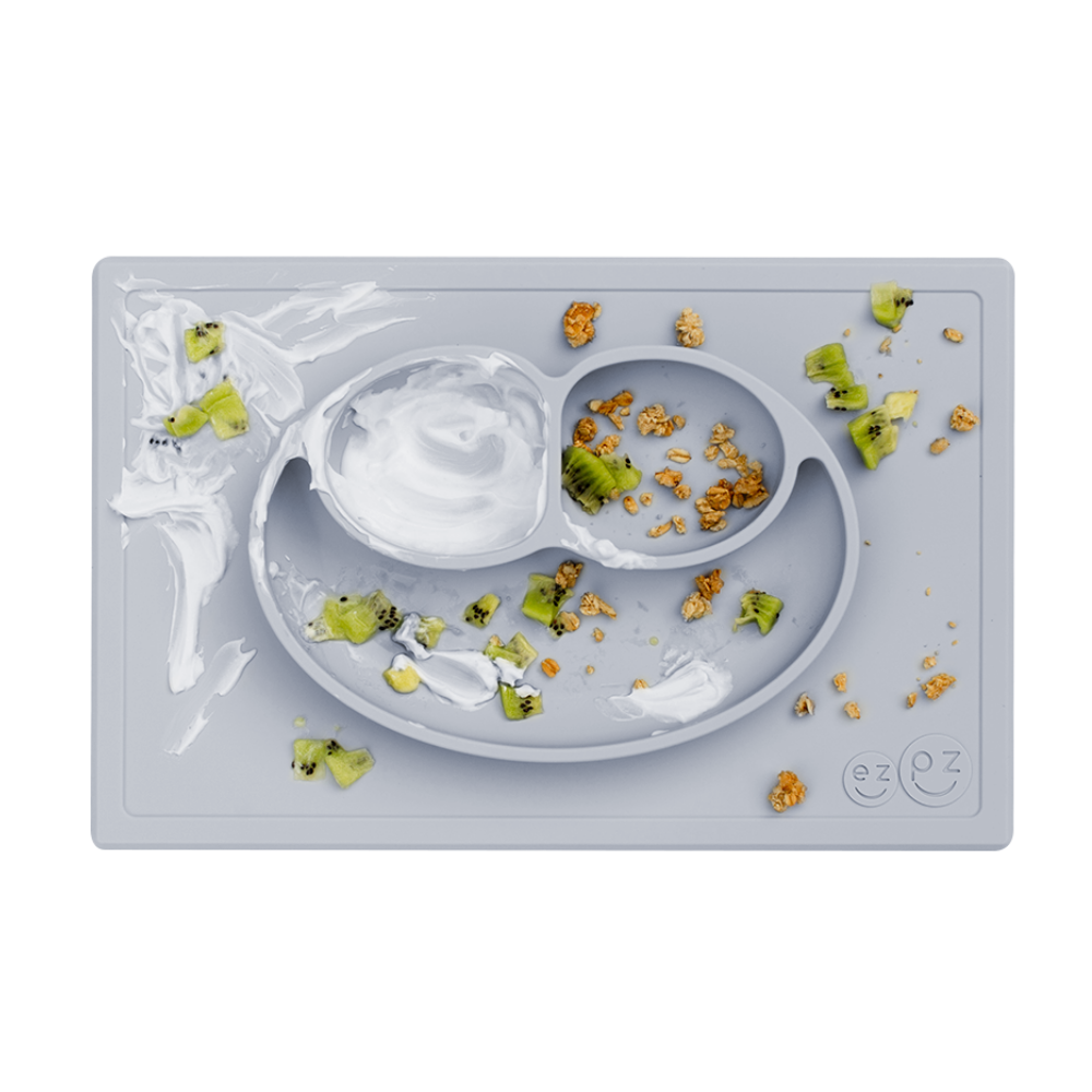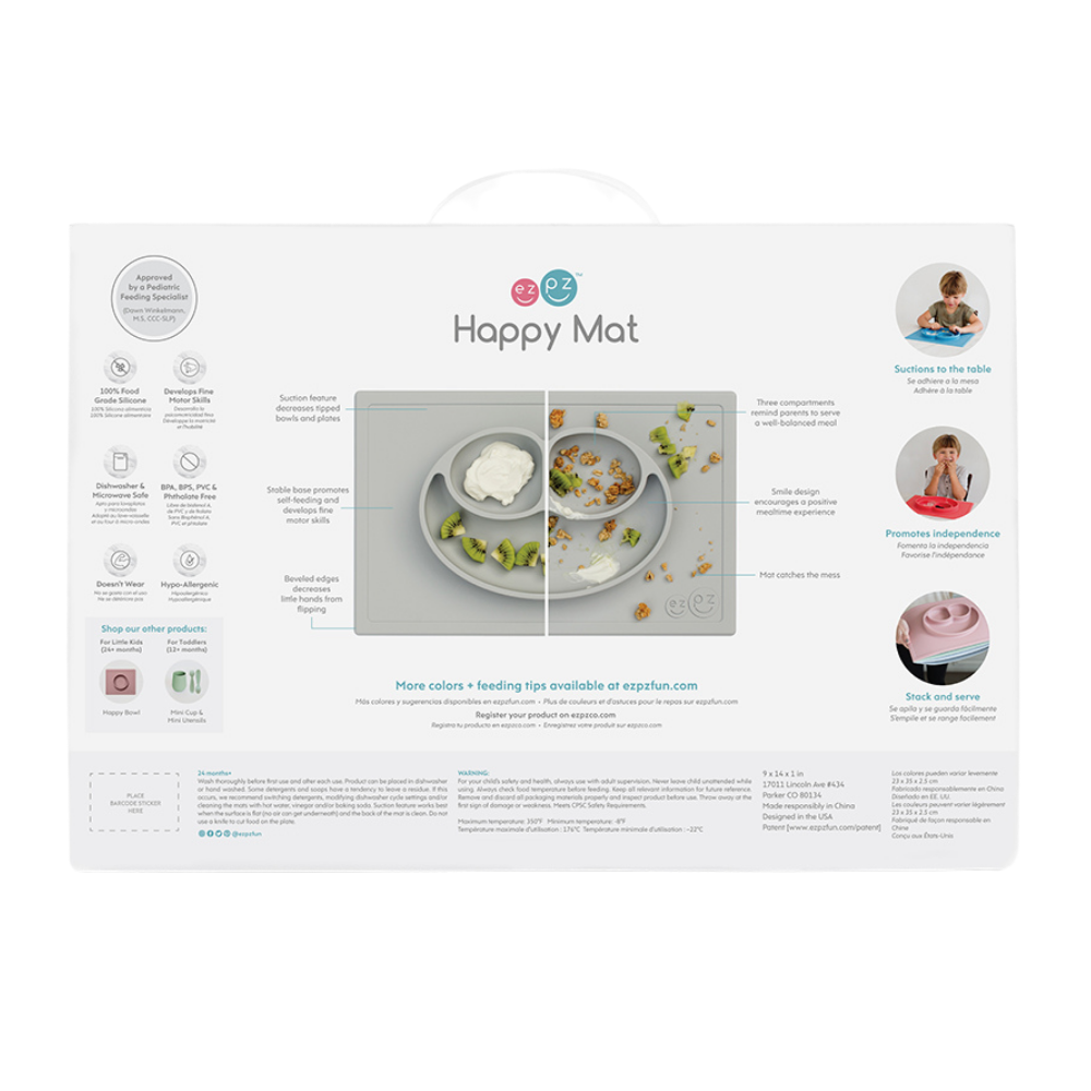 Happy Mat هو المنتج الرئيسي الحائز على جائزة ezpz. إنها مفرش طاولة متعدد الإمكانات + لوحة تلتصق بالطاولة ، مما يعني أنها تلتقط الفوضى وتقلل من الأوعية والأطباق المائلة. مصممة للأطفال الصغار ومرحلة ما قبل المدرسة.