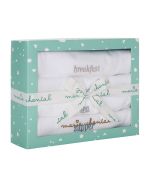 Milky breakfast mornings and messy dinner evenings, this beautiful Bib Set was designed with your baby’s dietary timetable in mind. Embroidered with Breakfast, Lunch, Tea and Supper, there’s a bib covered for every occasion. Presented in an exclusive Marie-Chantal gift box and a Tino drawstring bag for travel-friendliness, this set makes a great gift for newborn babies discovering their appetite. Available in Dusty Teal and Terracotta.