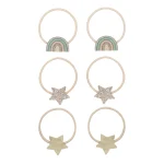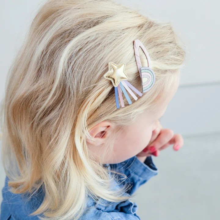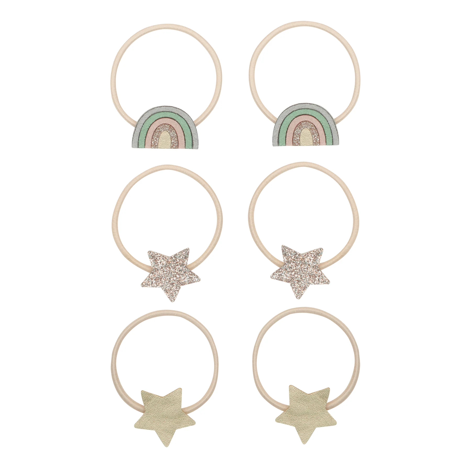 We adore this cheerful little pack of ponies! Two rainbows made from intricately cut leatherette in the dreamiest of colours attached to neutral elastics plus four stars in metallic gold and glitter!