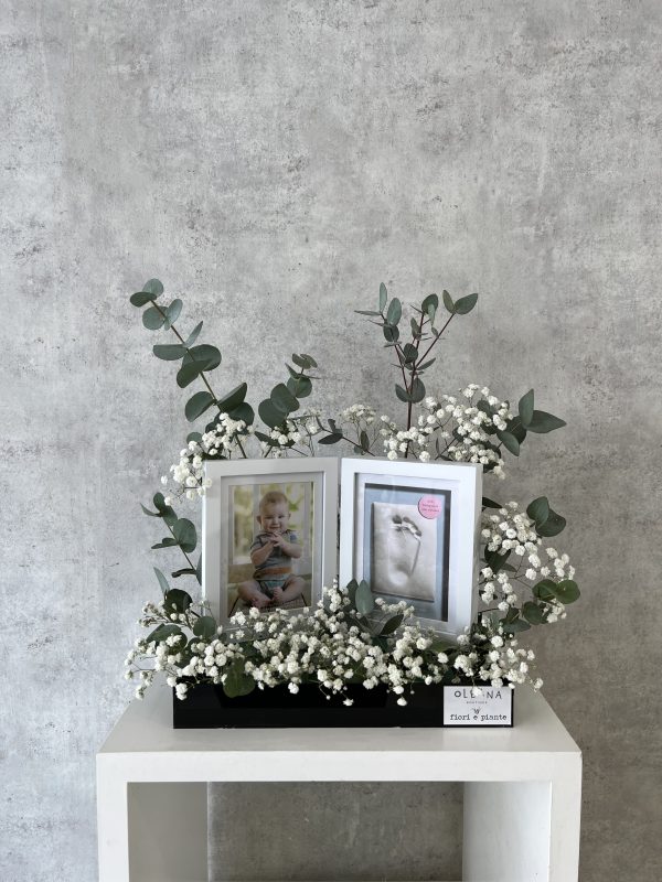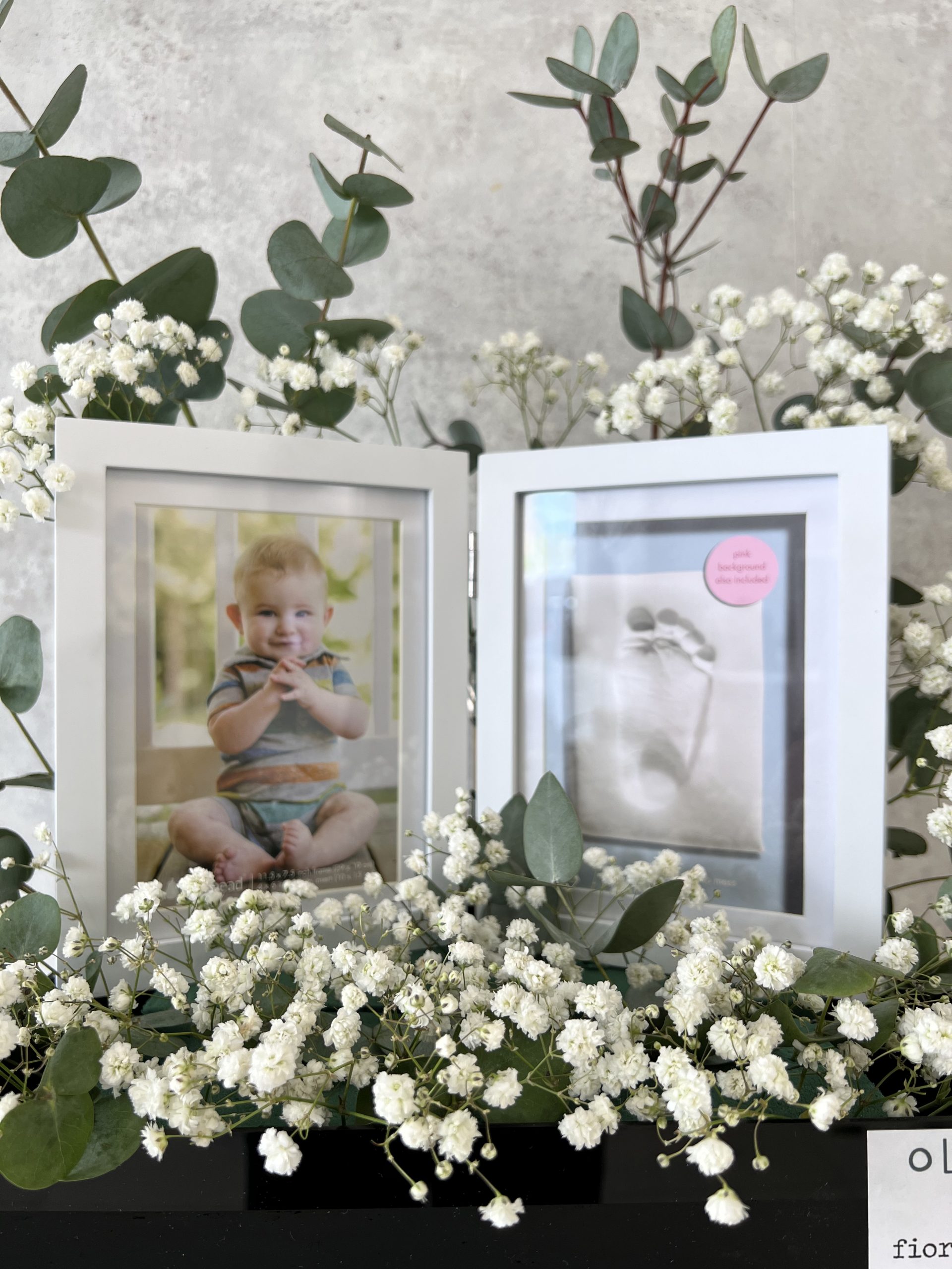 Celebrate the arrival of a new baby with our thoughtfully curated gift basket, designed to capture the essence of early parenthood. This exquisite basket features a delicate arrangement of white baby’s breath and eucalyptus flowers, bringing natural beauty and elegance to any space. Nestled among the blooms is a charming Pearhead picture frame, perfect for showcasing the baby’s first photo, along with a mold kit to create a lasting keepsake of the baby’s tiny foot.