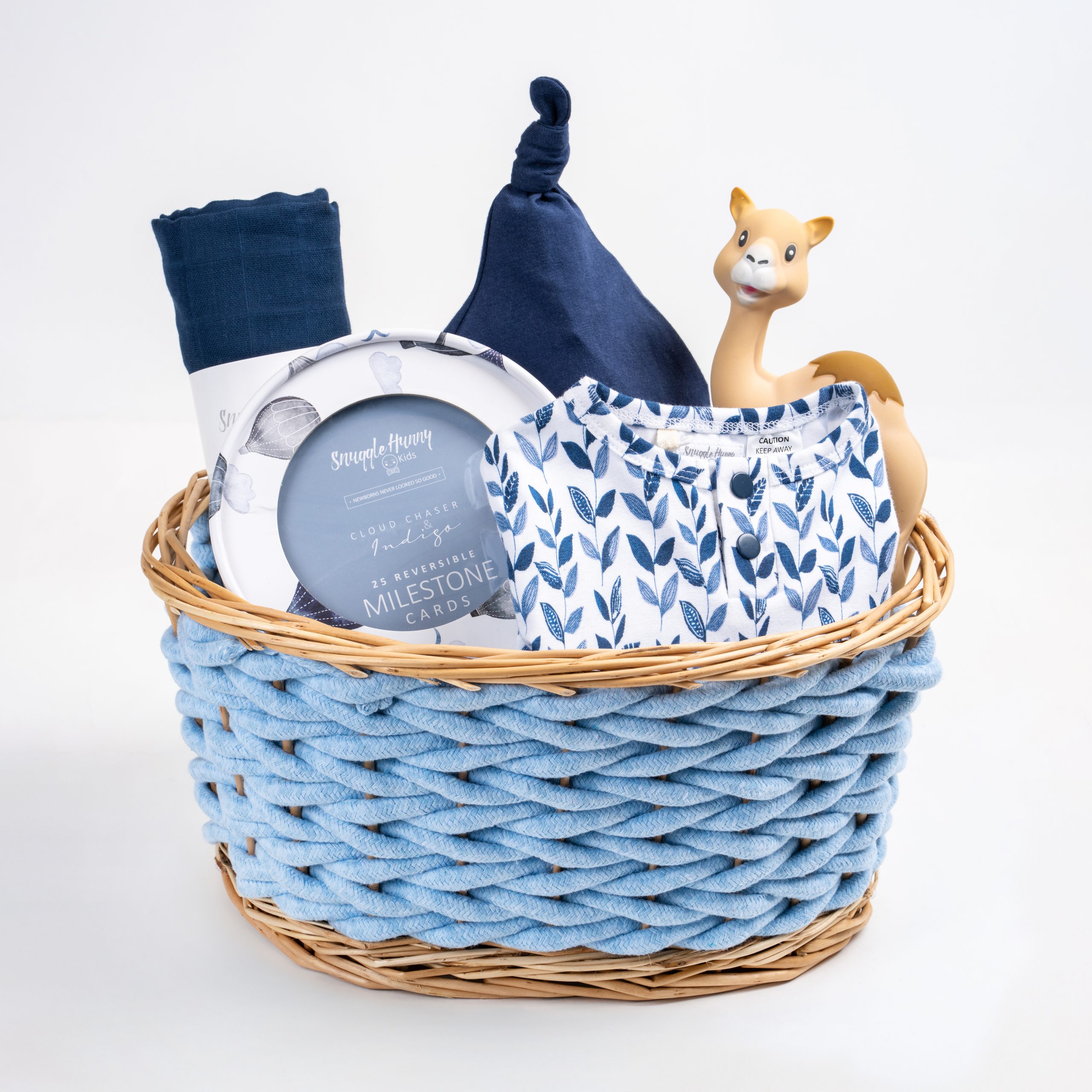 Presented in a stylish basket, the Indigo Gift Basket makes for a perfect baby shower gift or a thoughtful welcome-home present. Celebrate the joy of new beginnings with this delightful collection of essentials!