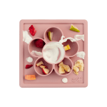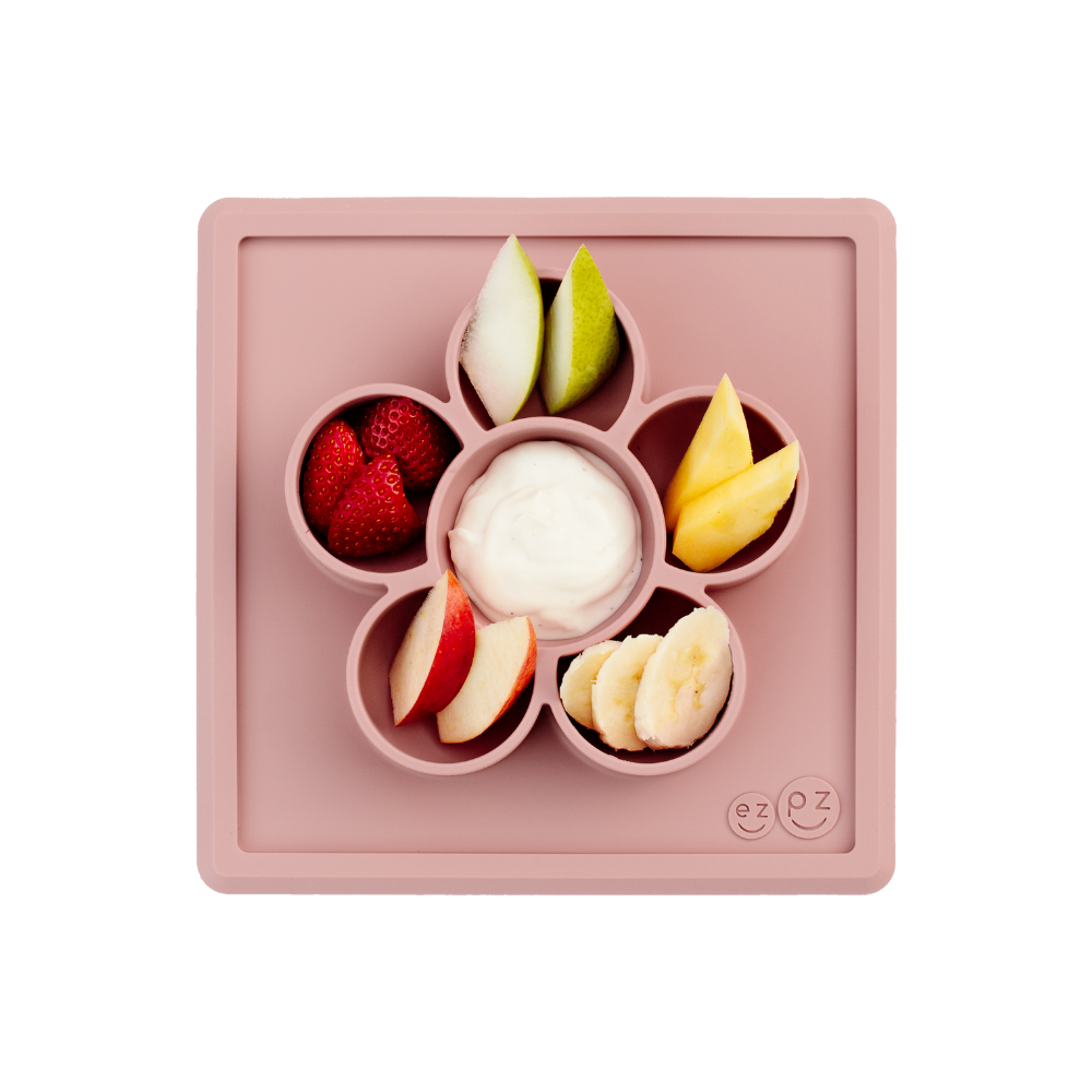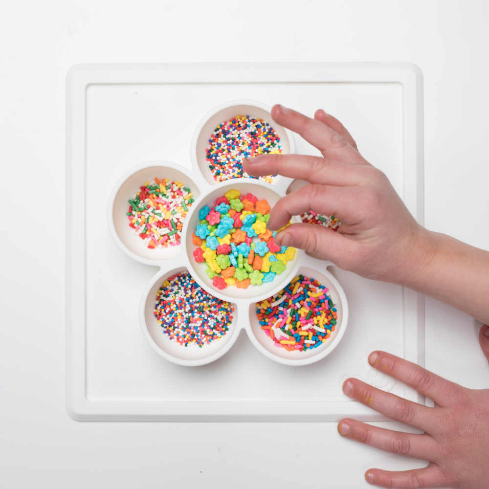 The Mini Play Mat is an all-in-one mat + flower compartments that assists with painting, sorting, beadwork and other crafts. It suctions directly to any flat surface, making it difficult for “crafting” hands to tip over their paints, glitter and beads.