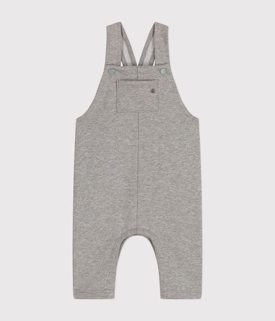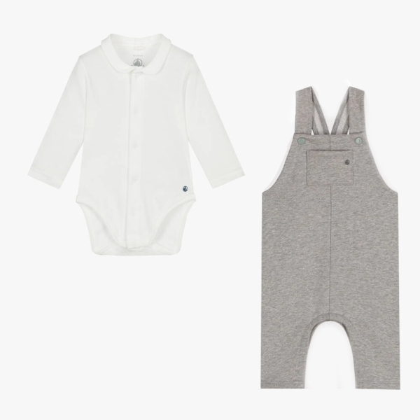 Adorable ivory and grey dungarees set for baby boys by Petit Bateau. Made in soft organic cotton jersey, the simple white bodyvest has a classic rounded collar and useful popper fastenings on the front and between the legs. The grey dungarees have adjustable straps fasten with buttons for a comfortable fit and there are poppers between the legs to help with changing.