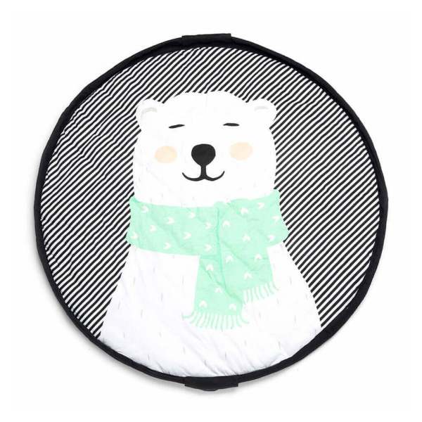 Lovely Play & Go play mat with a motif of a polar bear. On the outside, it is black and white striped with a nice, quilted design. The play mat has a wide, black edge all the way around it.