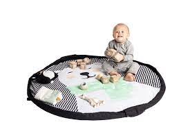 The Play & Go play mat is a large circular piece of fabric with a runner all the way around with a black string, so you can tie the mat together as a bag. You can store your toys in the bag, and when the children think that the toys should be brought into the living room, the bag can be opened and the play mat unfolds. Afterwards, it is quick and easy to clean up and put it back in place.