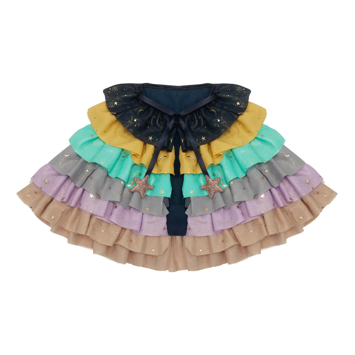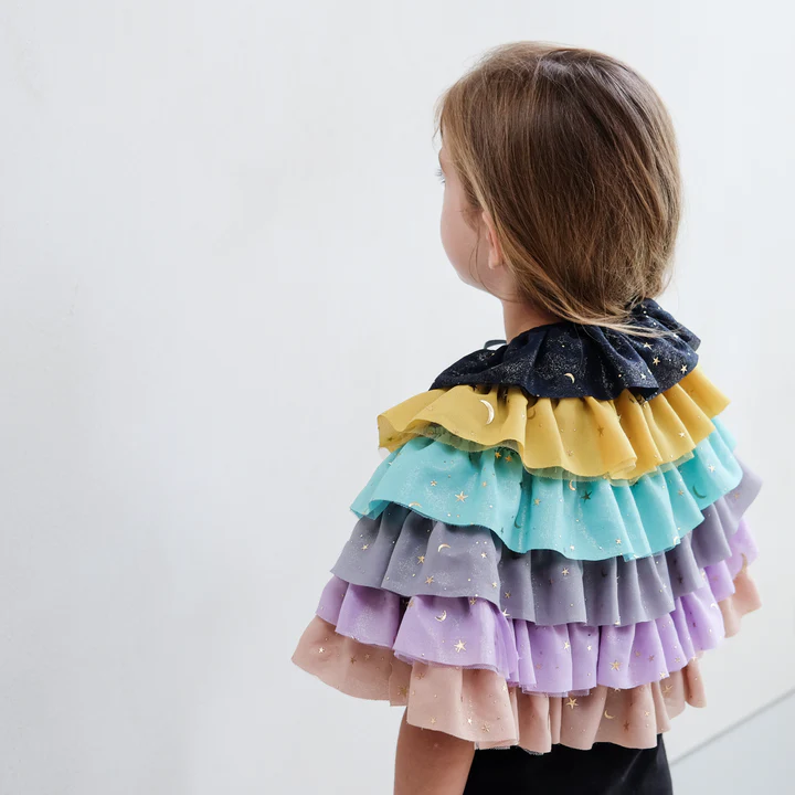 A fabulous new addition to our magical dress-up range, this bright and colourful ruffle cape is a must have for the dress up box! Perfect for imaginative play, parties or a one of a kind gift idea!