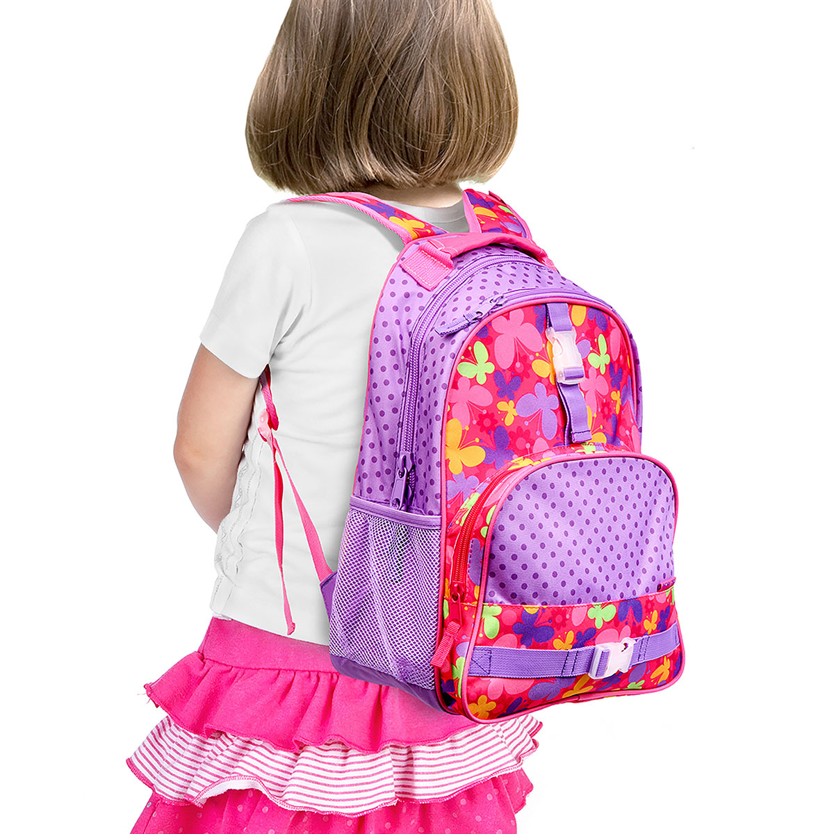 Our all-over-print backpack is totally cool for school. Perfectly holds full size folders with an inside pocket for special papers or artwork. Backpack features include mesh side pockets and cushioned adjustable shoulder straps. ID tag printed on inside to safely add your child’s information.