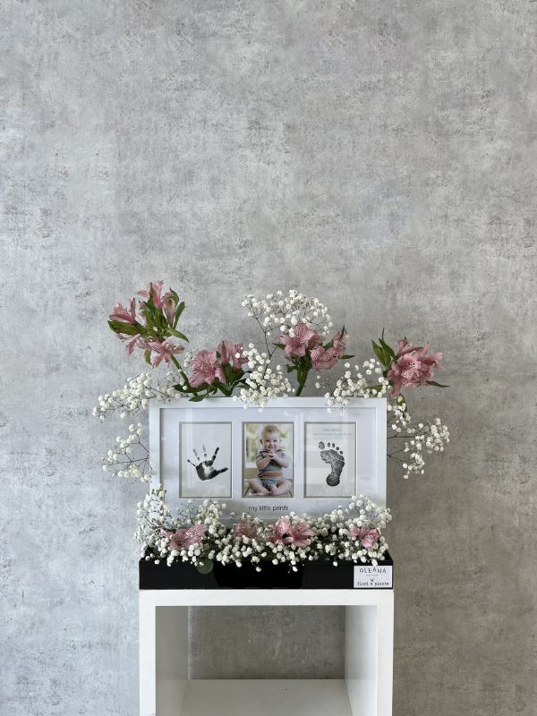 Celebrate the arrival of a new baby with our thoughtfully curated gift basket, designed to capture the beautiful moments of early parenthood. This elegant basket features a lovely arrangement of white baby’s breath and pink lilies, adding a touch of charm to any nursery.