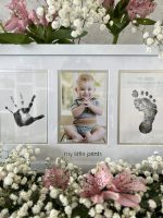 Included is a delightful picture frame for showcasing the baby’s first photo, along with an ink stamp kit to create lasting imprints of tiny hands and feet.