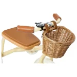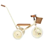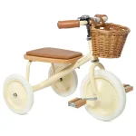 Each tricycle features a softly padded oak seat, vegan leather grips, wooden oak pedals, and a removable push handle for guided rides. The front wicker basket adds a charming touch, ideal for bringing along favorite toys.