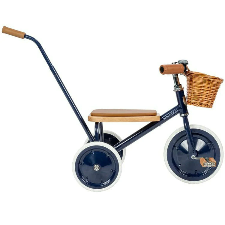 Each tricycle features a softly padded oak seat, vegan leather grips, wooden oak pedals, and a removable push handle for guided rides. The front wicker basket adds a charming touch, ideal for bringing along favorite toys.